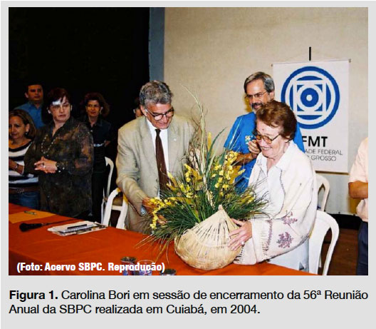 Nesse sentido, a atuação de Carolina Bori na SBPC é emblemática. "Sua atuação na SBPC chama a atenção pelas diversas iniciativas nas ciências, no Brasil, extrapolando o campo da Psicologia", escreveu Gabriel Cândido. Seu primeiro cargo na diretoria foi em 1973, como primeira secretária, assumindo posteriormente a secretaria geral (1977-1981), depois a vice-presidência (1981-1986) e, finalmente, a presidência (1986 a 1989). "Foi algo extraordinário uma mulher assumir a presidência da SBPC, mas, ao mesmo tempo, isso foi uma conquista que construiu ao longo de toda a sua trajetória na entidade guiada por uma visão iluminista da ciência, que, para ela, era um motor de desenvolvimento e de transformação do país", lembra Eda Tassara (Figura 1).