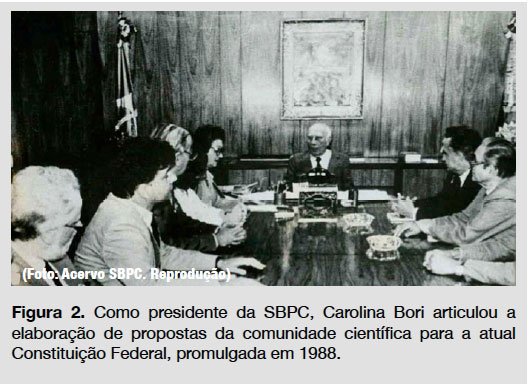 A Constituição de 1988 é a primeira que manifesta, de modo explícito, a importância estratégica da ciência e da tecnologia para o desenvolvimento socioeconômico do Brasil ao estabelecer que é responsabilidade do Estado promover o progresso da ciência visando ao desenvolvimento econômico e social e o bem-estar da população. O Artigo 218 determina que "a pesquisa científica básica receberá tratamento prioritário do Estado, tendo em vista o bem público e o progresso das ciências". "Acredito que Carolina Bori fez parte de uma comunidade de grandes nomes da ciência brasileira, como Milton Santos e Cesar Lattes, pessoas que tinham um programa para o país. E isso fez toda a diferença!", destaca Gloria Malavoglia, bióloga e idealizadora do Canal Ciência, um serviço de divulgação científica do Instituto Brasileiro de Informação em Ciência e Tecnologia (IBICT). "Em minha opinião, Carolina Bori representa essa geração de cientistas ao captar essa vontade de expandir as fronteiras da academia e criar uma ponte com a sociedade", complementa (Figura 2).